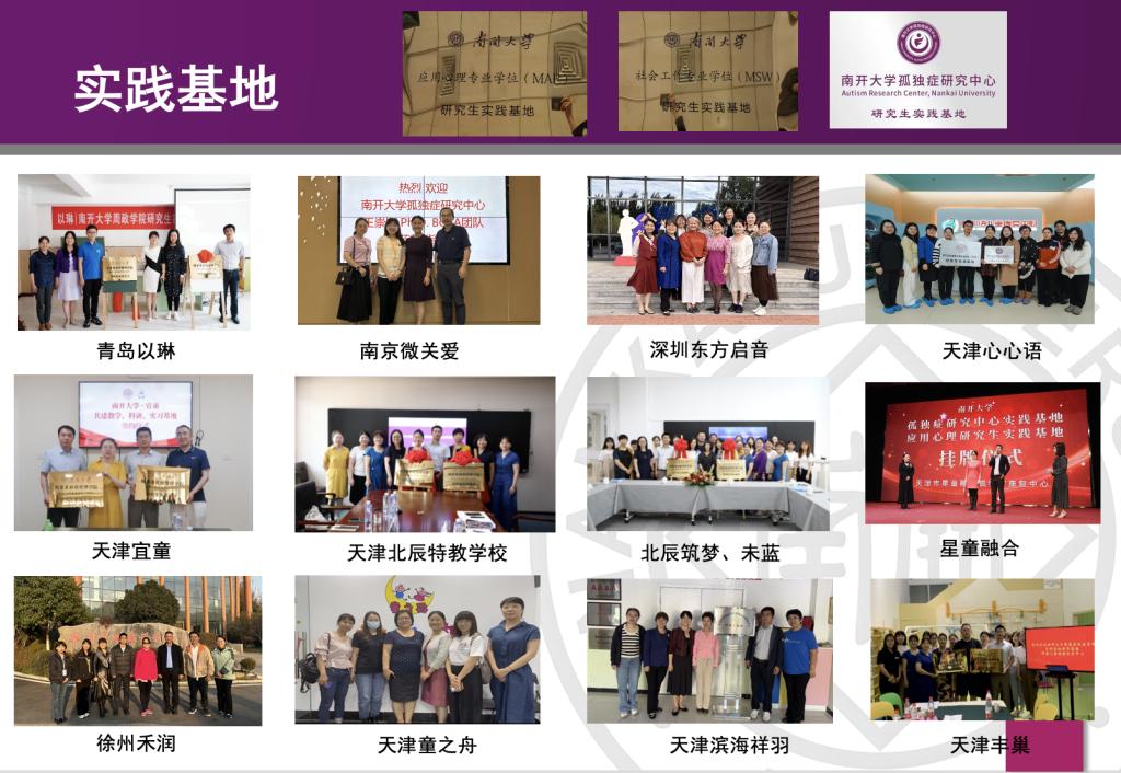 已先后与天津市北辰区特殊教育学校、天津市北辰区筑梦残疾人培训中心、天津宜童孤独症研究服务中心、天津市蜂巢儿童健康发展中心、天津市滨海新区祥羽孤独症康复中心、天津市星童融合孤独症康复中心、天津市心心语孤独症与脑瘫儿童康复服务中心、青岛以琳康教展能中心等8家孤独症康复机构签订了不同时长的专业学位研究生联合培养实践基地协议书,为MAP和MSW学生提供了多个实习实践岗位。