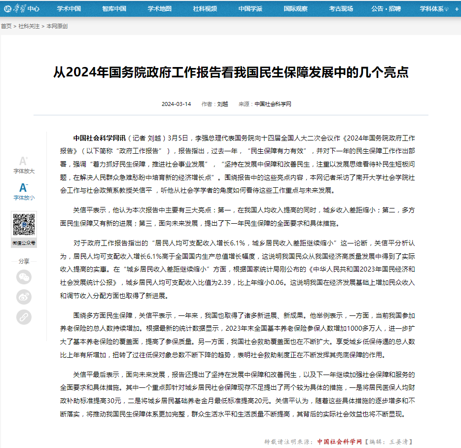 社会建设与管理研究院教授关信平,原文3月14日载于中国社会科学网(从2024年国务院政府工作报告看我国民生保障发展中的几个亮点-中国社会科学网 (cssn.cn))