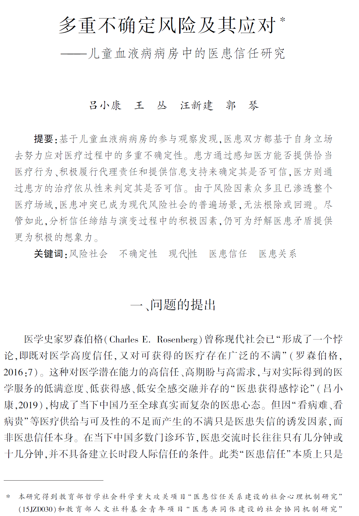汪新建教授团队长期从事医疗与健康议题的社会心理学研究。在之前承担的国家社科基金和教育部人文社科基金项目“西方家庭治疗理论的新进展研究”(03BSH003)、“心理咨询与治疗的叙事转向研究”(06JA840011)、“从本土文化看中国人心理问题躯体化之成因”(09BSH044)中,该团队就已涉足不同层面的医患互动研究,并先后在《心理学报》上发表论文《意象思维与躯体化症状:疾病表达的文化心理学途径》(2012),在《社会学研究》上发表论文《因果判定与躯体化:精神病学标准化的医学社会学反思》(2013)。这些成果为团队进入医患关系领域的研究奠定了基础。