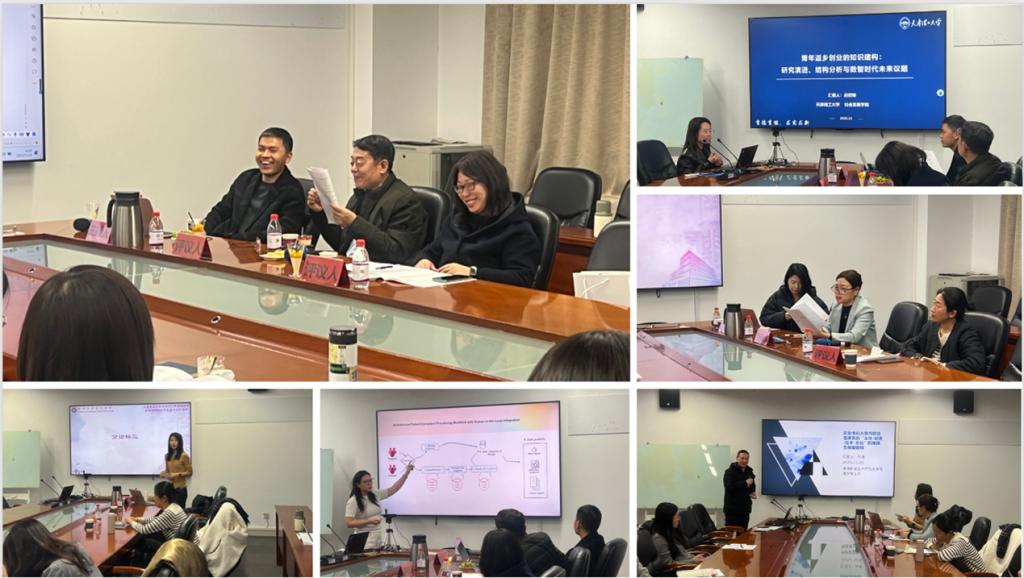 王淼副教授主持,天津师范大学毕宏音研究员、天津社会科学院王光荣研究员评议。河北工业大学文太林副教授、檀若楠同学,天津理工大学徐立娟博士、硕士研究生韩文婕、刘宇晨、宋彦霖、王艺颖、籍馨暄,中国民航大学裴一凡同学等进行了发言,分享了社保政策、数字赋能乡村文旅、新业态女性农民工赋能等研究成果。