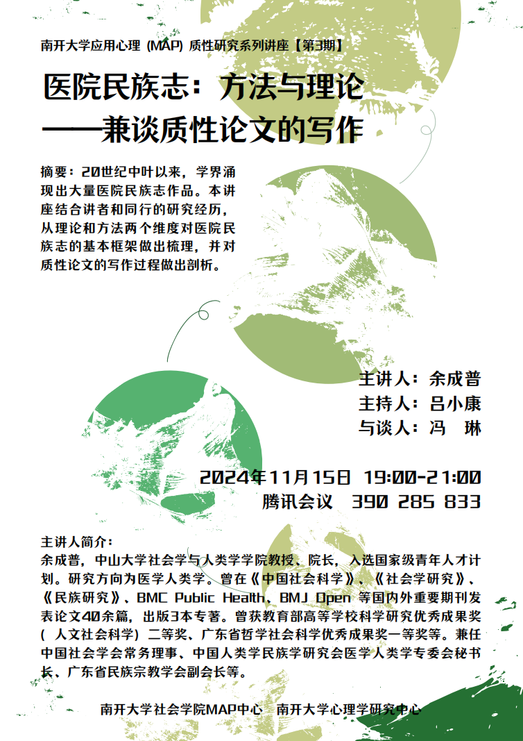 摘要:20世纪中叶以来,学界涌现出大量医院民族志作品。本讲座结合讲者和同行的研究经历,从理论和方法两个维度对医院民族志的基本框架做出梳理,并对质性论文的写作过程做出剖析。