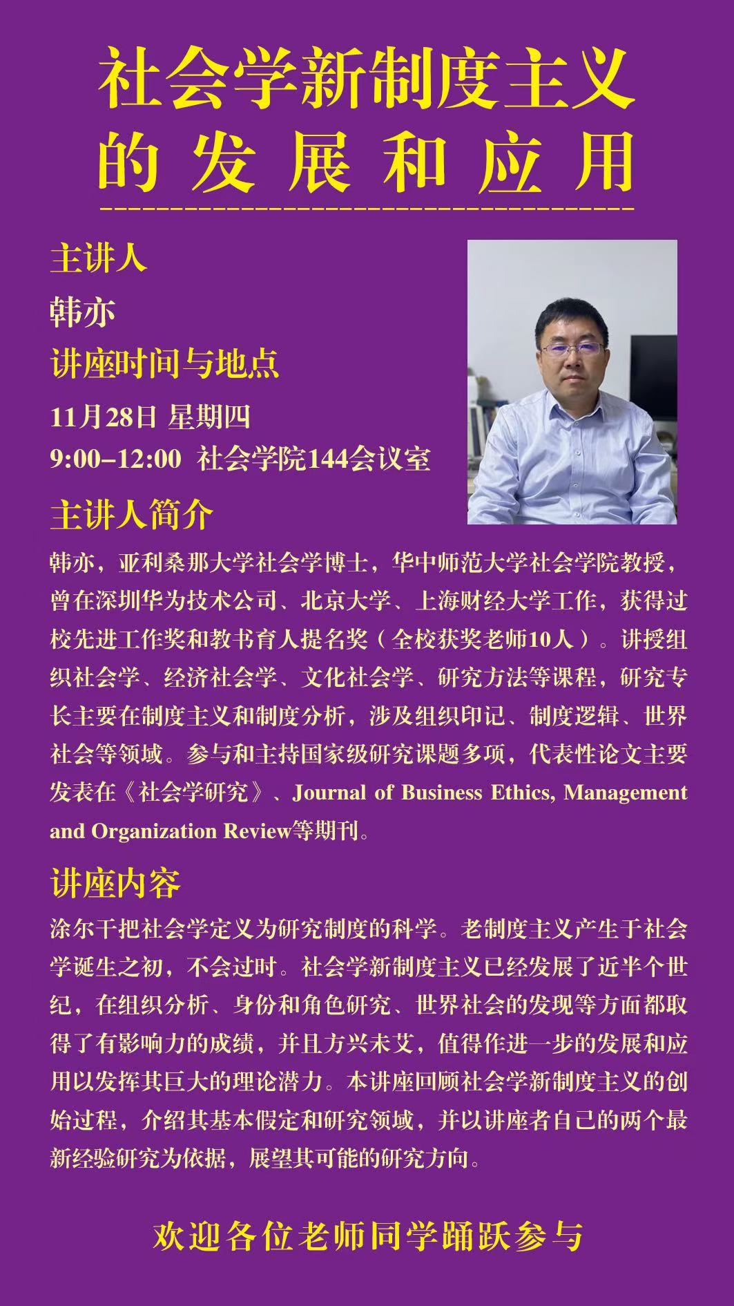 涂尔干把社会学定义为研究制度的科学。老制度主义产生于社会学诞生之初,不会过时。社会学新制度主义已经发展了近半个世纪,在组织分析、身份和角色研究、世界社会的发现等方面都取得了有影响力的成绩,并且方兴未艾,值得作进一步的发展和应用以发挥其巨大的理论潜力。本讲座回顾社会学新制度主义的创始过程,介绍其基本假定和研究领域,并以讲座者自己的两个最新经验研究为依据,展望其可能的研究方向。