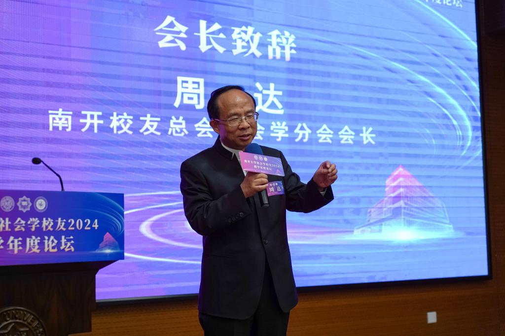 资深校董、南开校友总会副理事长、社会学分会会长、1987级社会学系硕士校友周达致辞。他说,学院和校友分会成立近一年来,开展了大量卓有成效的工作,取得了一系列骄人可喜的成绩。学院和校友分会的成立,是南开社会学人生活中的一件大事,其目的是要促进南开社会学科的发展,走在时代前列。今后分会将进一步完善组织框架,整合全球校友资源,为校友和母校师生之间搭建更多教育教学、研究实践、合作交流的平台。