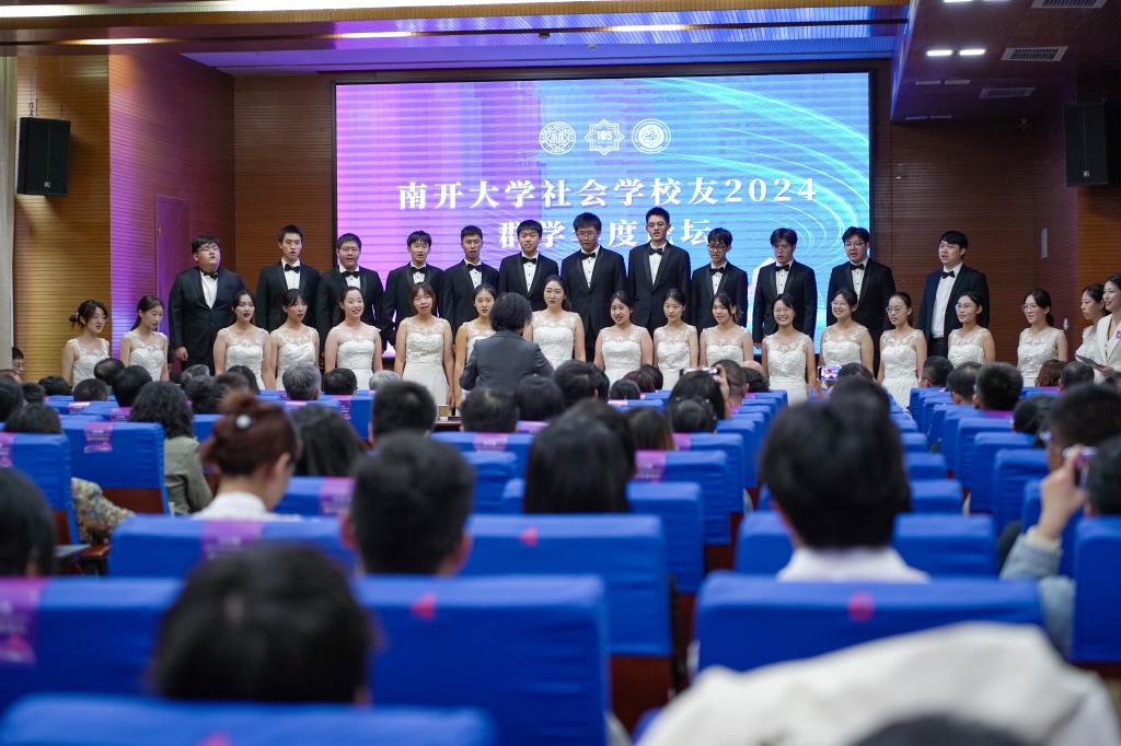 学生合唱团带来的精彩演出《美丽的南开我的家》《青春舞曲》和南开校友总会社会学分会一周年总结视频,论坛正式拉开帷幕。