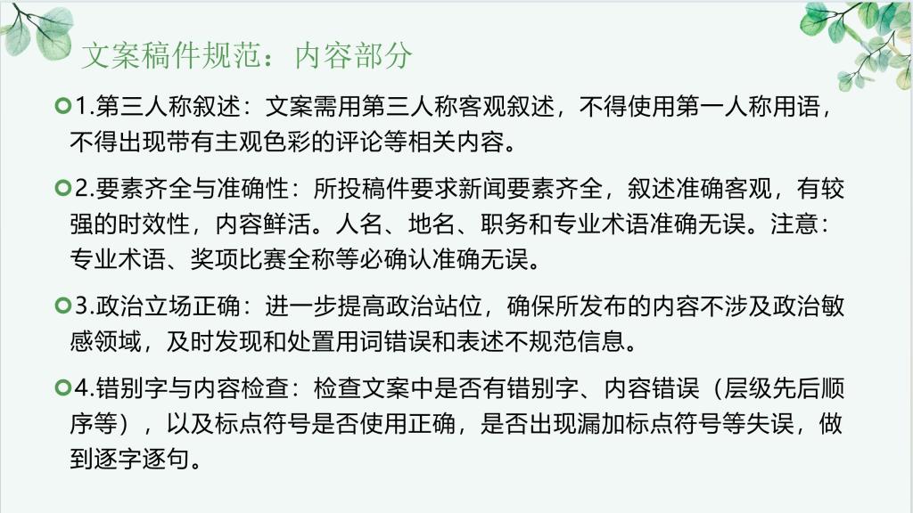 会议第二部分,团委宣传部内容中心张语甜讲解了各部门工作中必不可少的文案撰写的规范,从文案稿件规范、摄影与图片稿件规范、邮件的规范三个部分依次进行了介绍。其中关于文案稿件撰写部分的人称叙述、要素齐全性与准确性,以及摄影与图片稿件部分的图片质量与格式、图片来源与命名等内容的具体说明,对参会的成员们统一工作成果、体现专业性有着补缺式的提升。