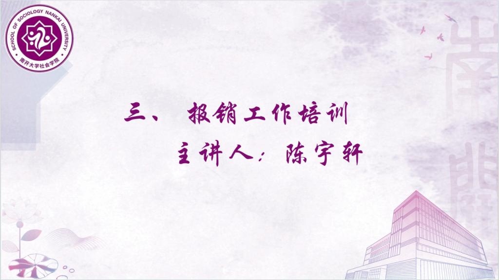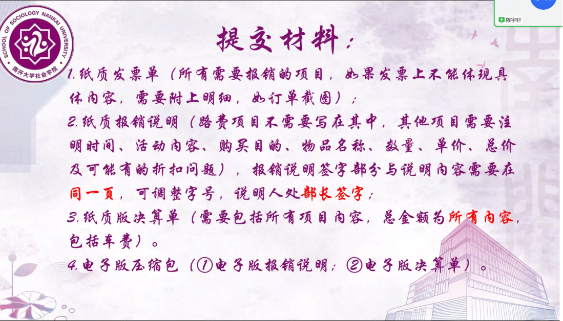 会议第三部分,学院学生会主席陈宇轩围绕财务报销工作开展了培训,帮助参会成员从提交材料、预算工作、路费项目、其他注意事项四方面熟悉了报销的步骤与要求,在此基础上对于各部门成员普遍不熟悉的操作,如决算单填写、报销说明、对公转账等进行了生动演示;对于容易出现不规范的情况,如报销票据黏贴做了举例说明。培训内容实用性强,对相关工作的开展大有裨益。
